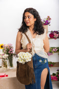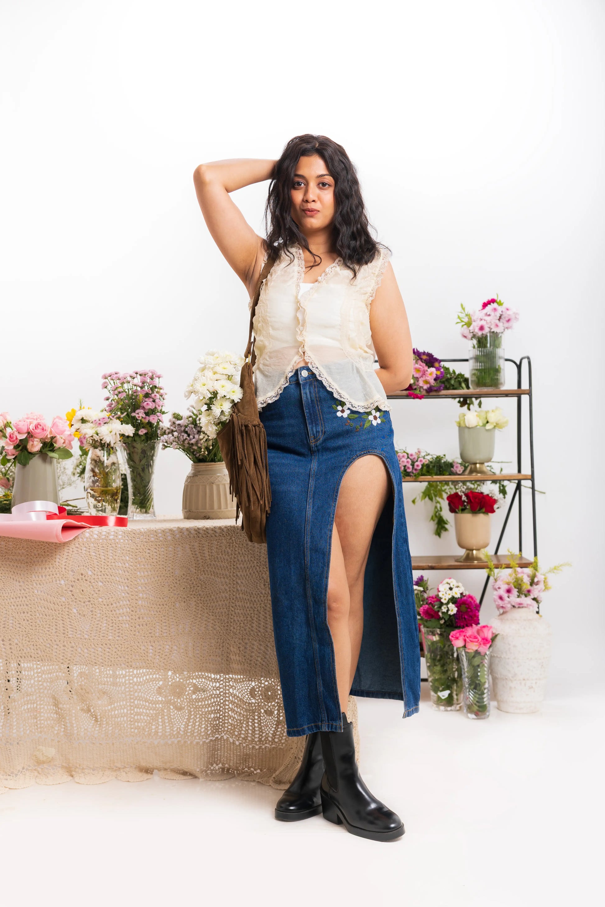 Woman wearing a white lace top and blue denim skirt with floral embroidery, holding a brown bag.