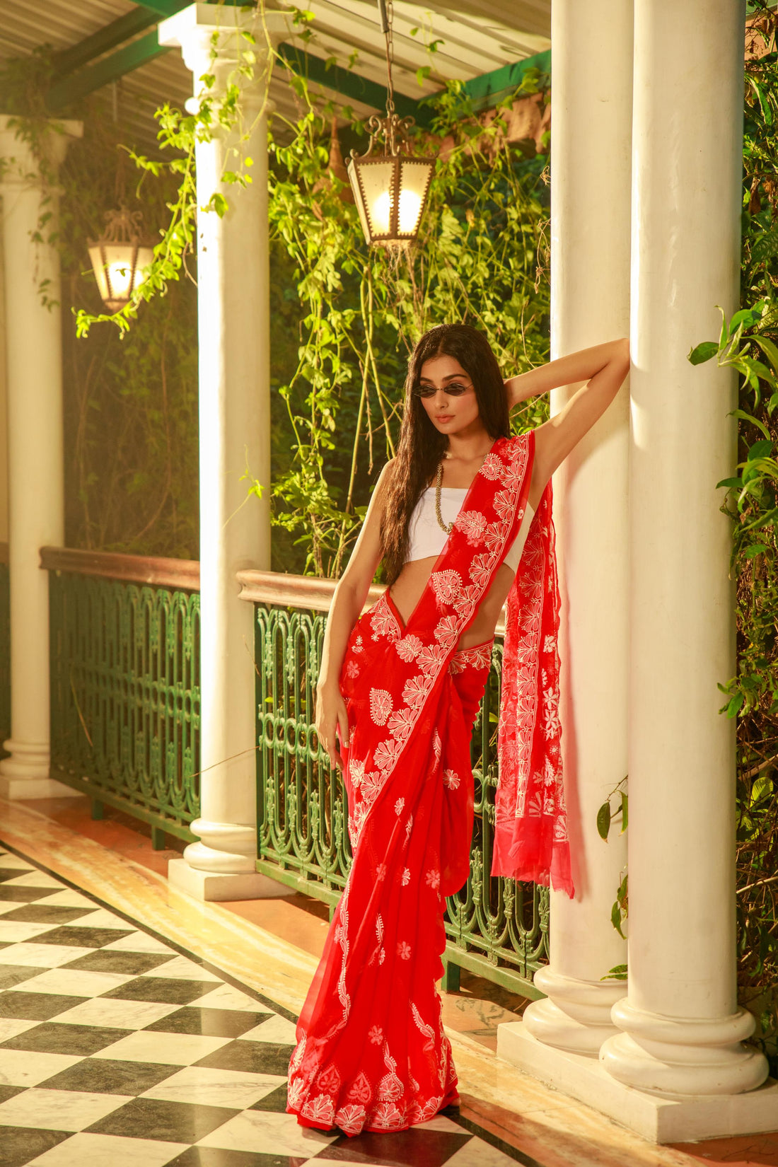Beautiful, elegant, and timeless, this green Chikankari saree is an authentic masterpiece. Made from viscose...