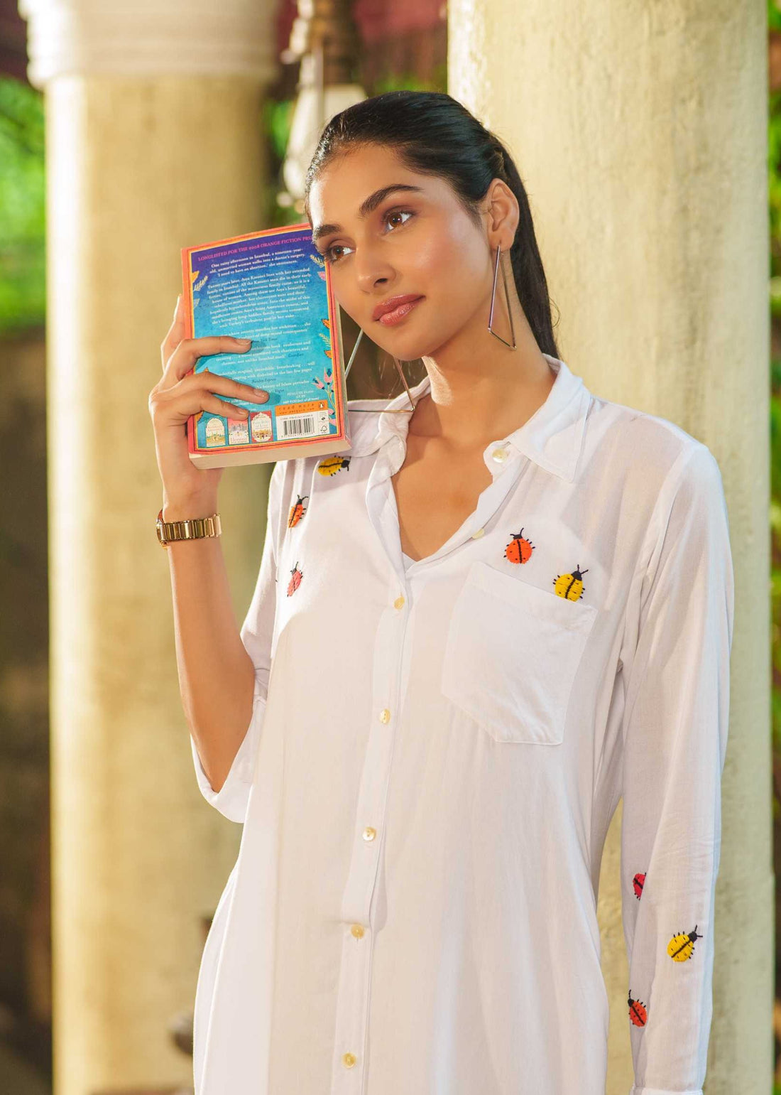 This long shirt dress is crafted from Modal fabric, featuring handmade, colorful bug designs in...