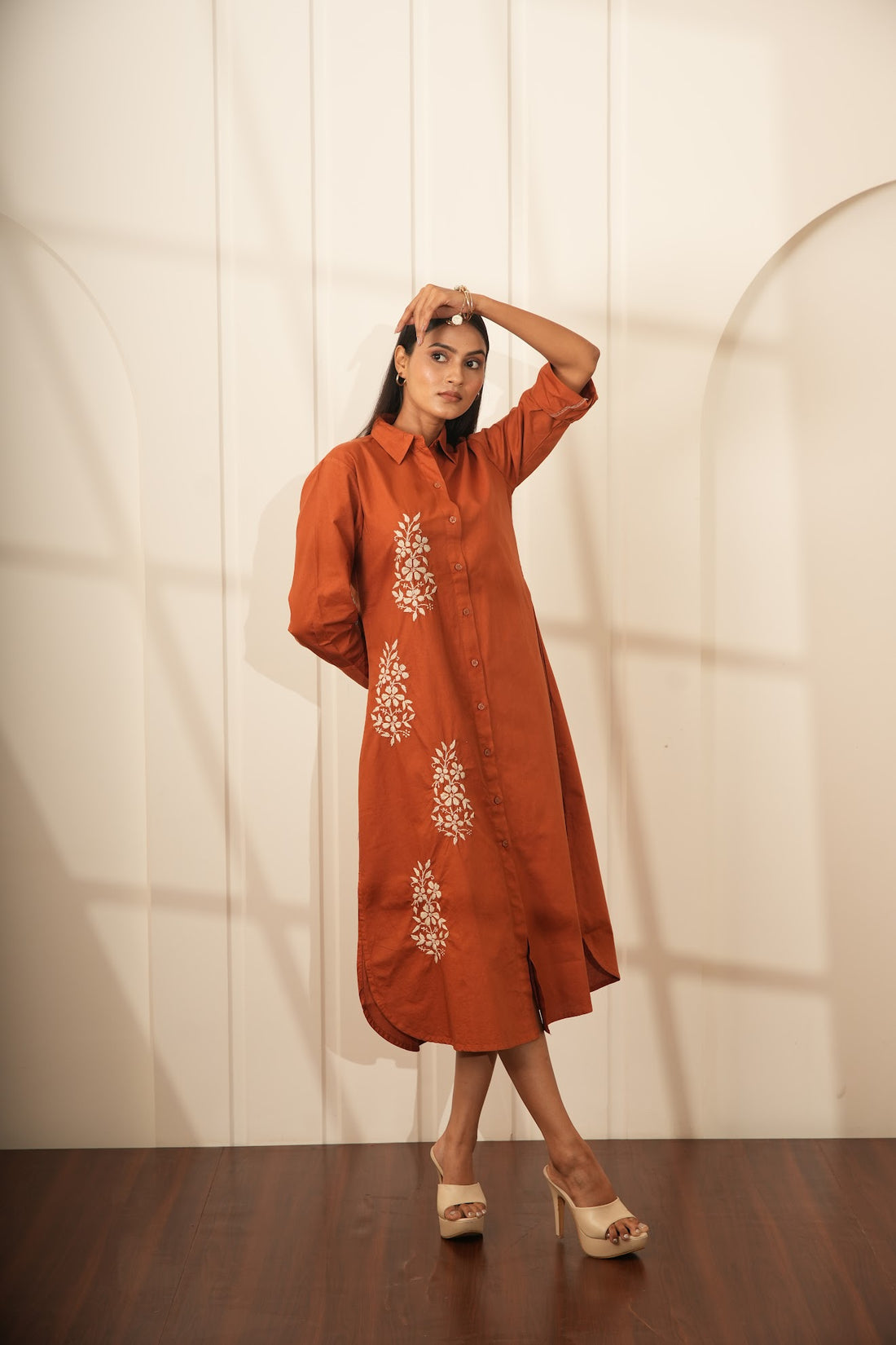 Make a bold yet elegant statement in our Amber Rust Chikankari Shirt Dress, tailored from...