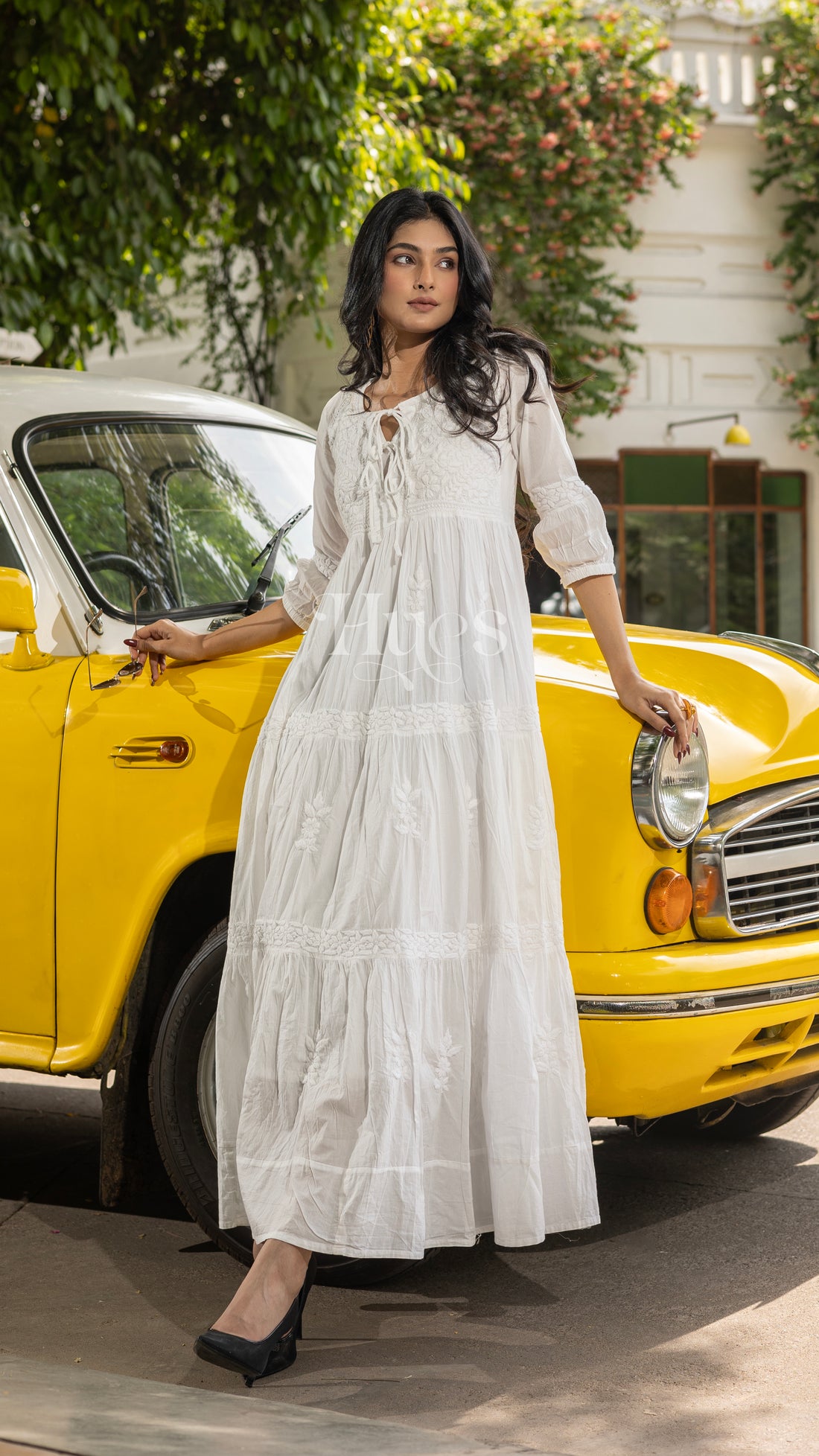 Behold our pure Mul cotton 3-layered one-piece dress, adorned with exquisite handmade 3D Chikankari work....